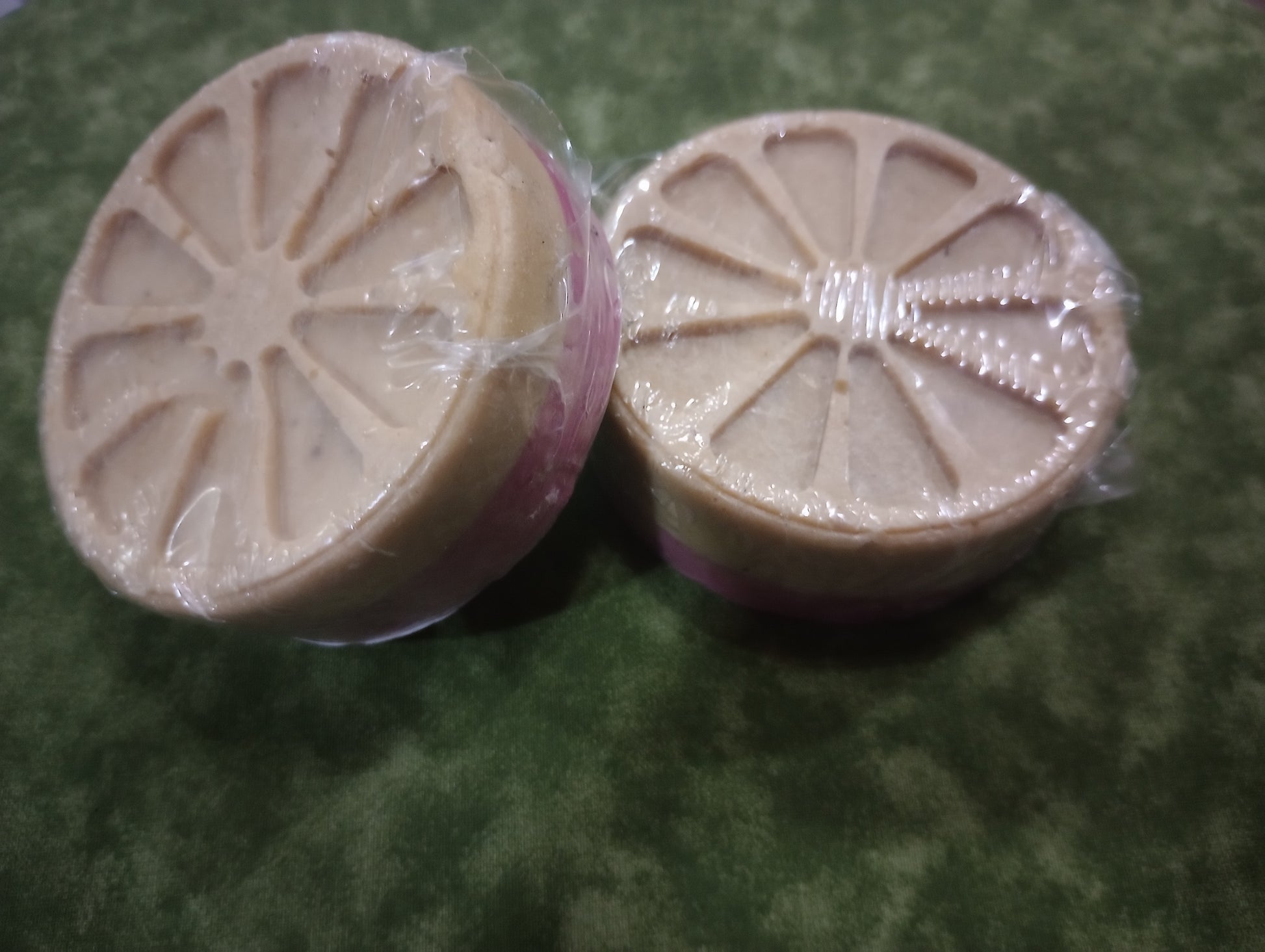 Organic Neem powder, lavender flower, lavender essential oil, pink and yellow micca powder for colorant, handcrafted into a shea butter soap base